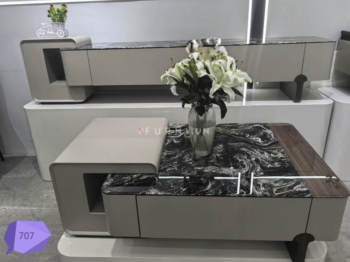 Bàn trà Marble Harmony mang phong cách hiện đại pha chút tinh tế sang trọng. Mặt bàn đá vân tự nhiên kết hợp đường bo cong mềm mại tạo nên điểm nhấn thanh lịch cho không gian. Thiết kế chắc chắn, bề mặt bóng đẹp, vừa tiện dụng vừa tôn lên vẻ đẳng cấp cho phòng khách.