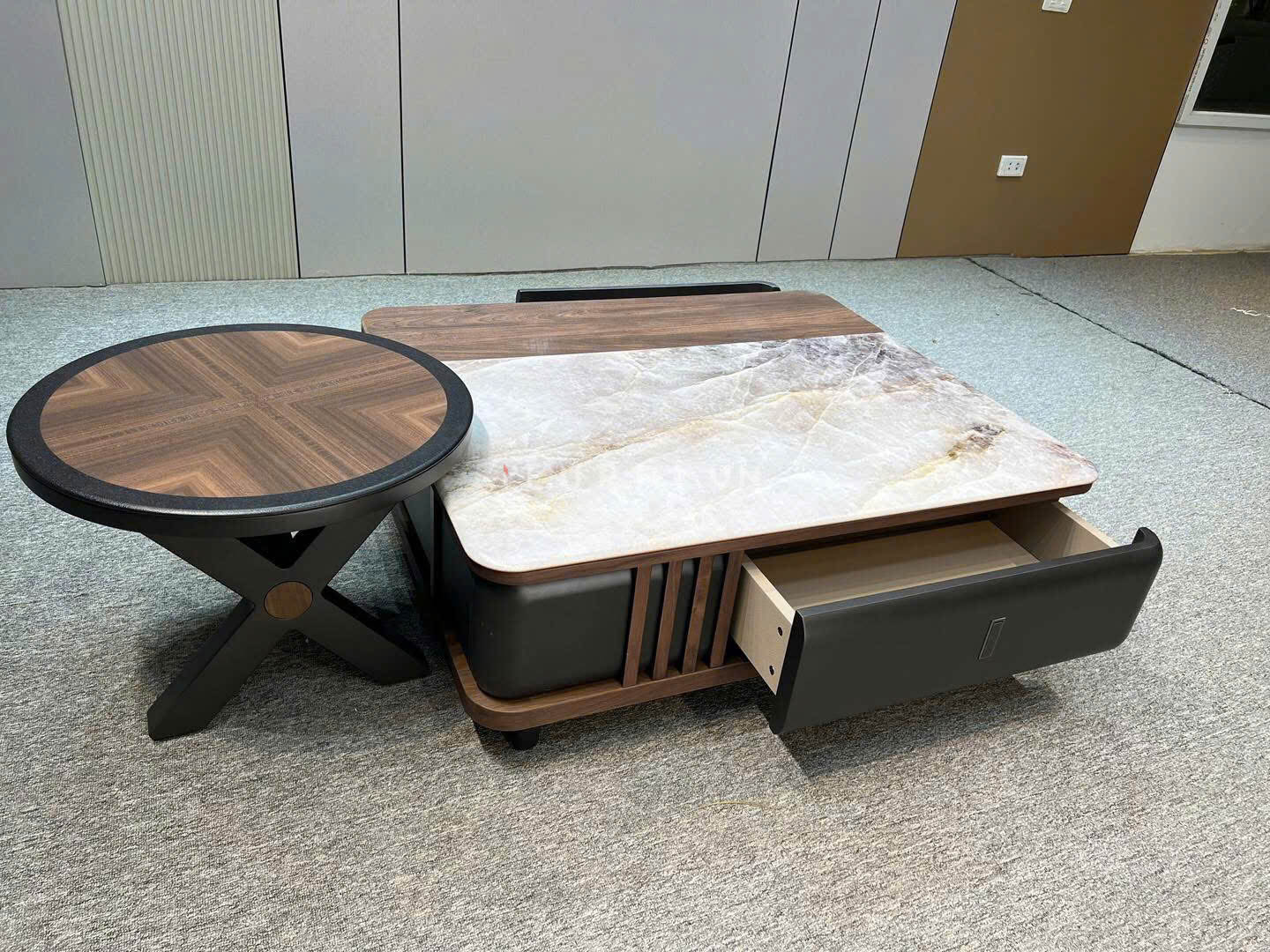 Set bàn gồm bàn lớn đi kèm bàn phụ tròn đồng bộ, tạo sự cân đối và tiện dụng. Bàn phụ có thể dùng để đặt hoa, khay trà hoặc decor, giúp không gian tiếp khách trở nên tinh tế và đầy tính thẩm mỹ.