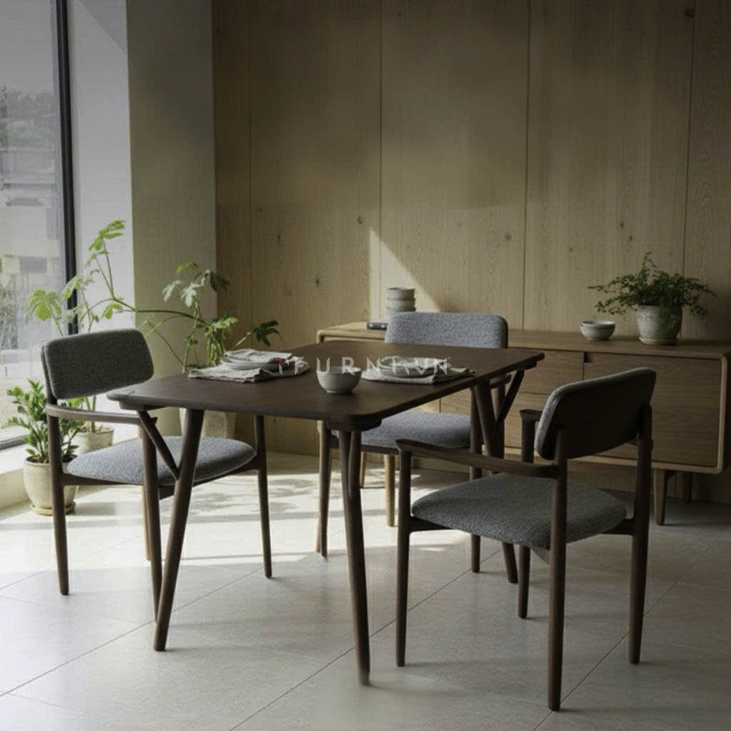 Bàn ăn gỗ tự nhiên mang phong cách Bắc Âu tinh tế, thiết kế tối giản với đường nét thanh mảnh nhưng chắc chắn. Mặt bàn giữ nguyên vân gỗ mộc mạc, kết hợp cùng gam màu ấm áp mang lại cảm giác gần gũi và sang trọng cho không gian. Bộ ghế đồng bộ với phần nệm bọc vải mềm, tone màu trung tính nhẹ nhàng, giúp tạo nên không gian ăn uống ấm cúng, thoải mái và đầy cảm hứng. Phù hợp cho gia đình yêu thích phong cách hiện đại nhưng vẫn đề cao sự tự nhiên và tinh tế.