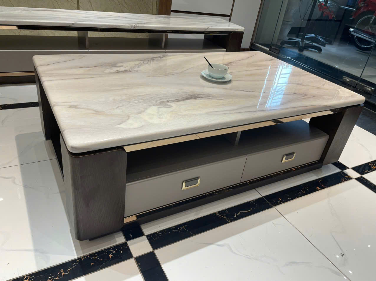 Mẫu bàn trà gây ấn tượng với mặt đá vân tự nhiên tone sáng, nhìn sạch sẽ và rất sang. Thiết kế dáng thấp, bản mặt dày, kết hợp khung gỗ chắc chắn tạo cảm giác bền bỉ và đẳng cấp ngay từ cái nhìn đầu tiên.